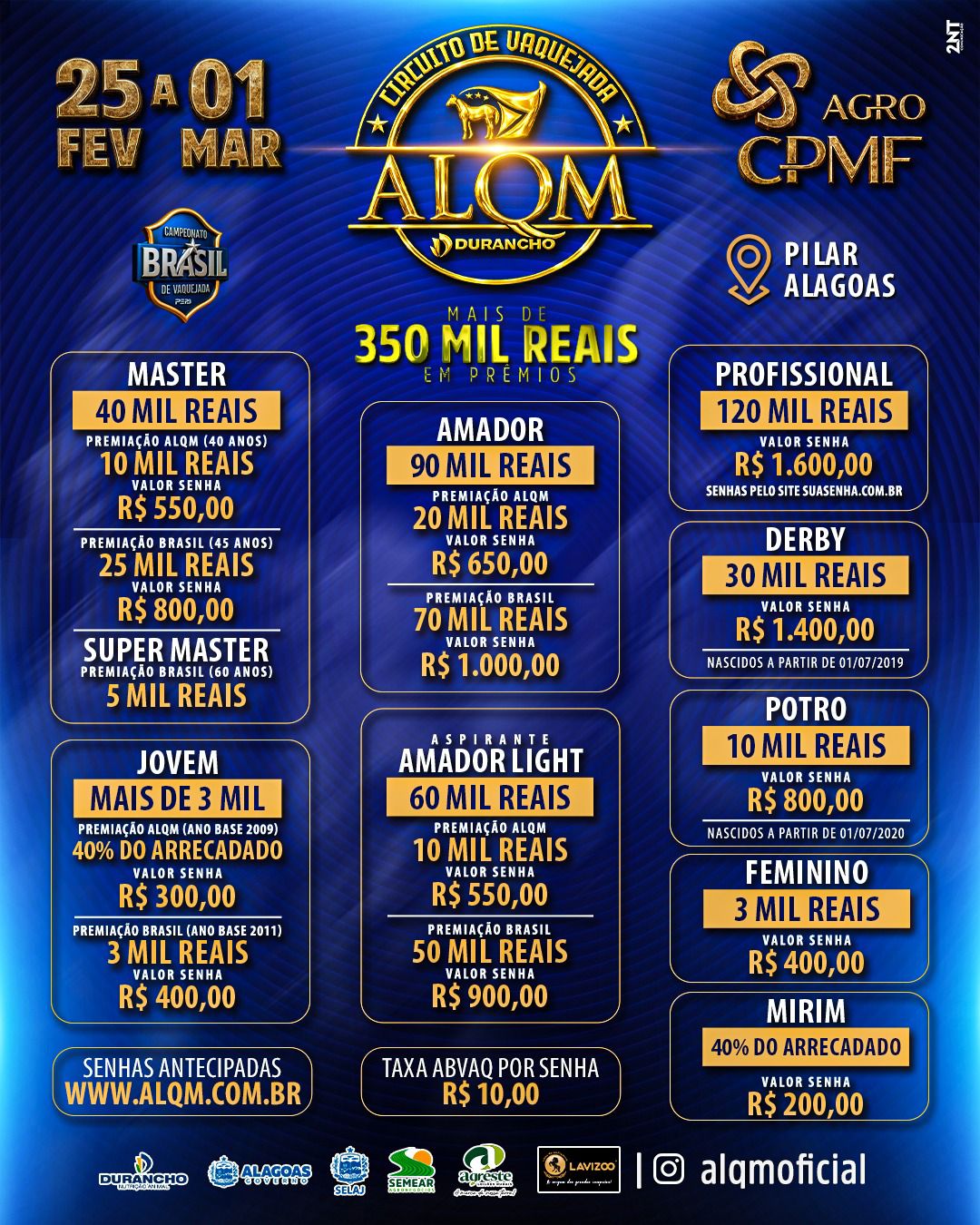 A 2ª Etapa do Circuito ALQM Durancho de Vaquejada será realizada na Arena CPMF , em Pilar –... saiba mais